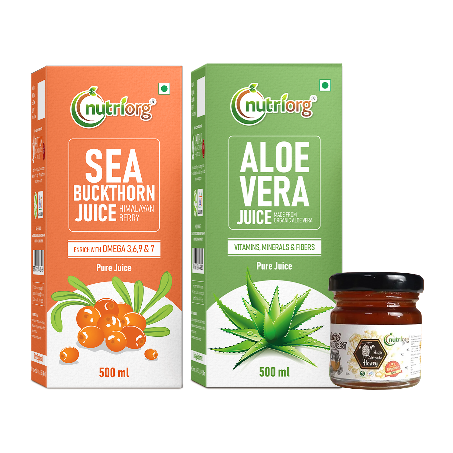 Nutriorg Sea Buckthorn and Aloe Vera Juice Combo are a combination product that is beneficial for skin, hair, digestion and immunity. It is an excellent antioxidant and helps to boost immunity. It is beneficial for hair, skin as well as digestion. Nutriorg Sea buckthorn Juice is 100% pure and unadulterated. The concentrated juice can be consumed daily by mixing some amount of water as per personal taste. Nutriorg Aloe vera is a multifaceted medicinal plant. The plethora of values and qualities that an Aloe vera plant possesses can't remotely be compared to any other plant or herb.