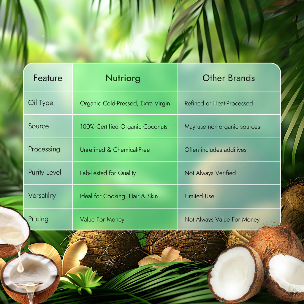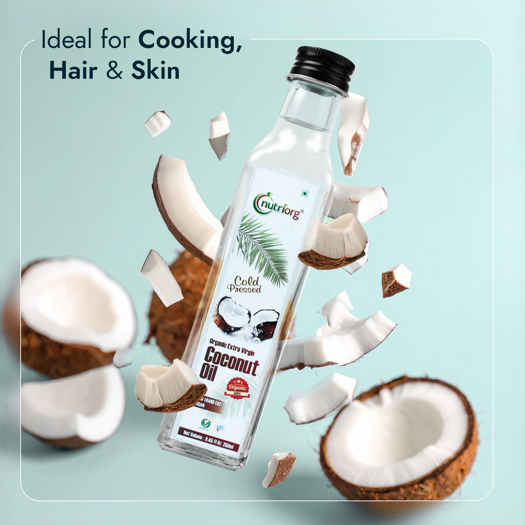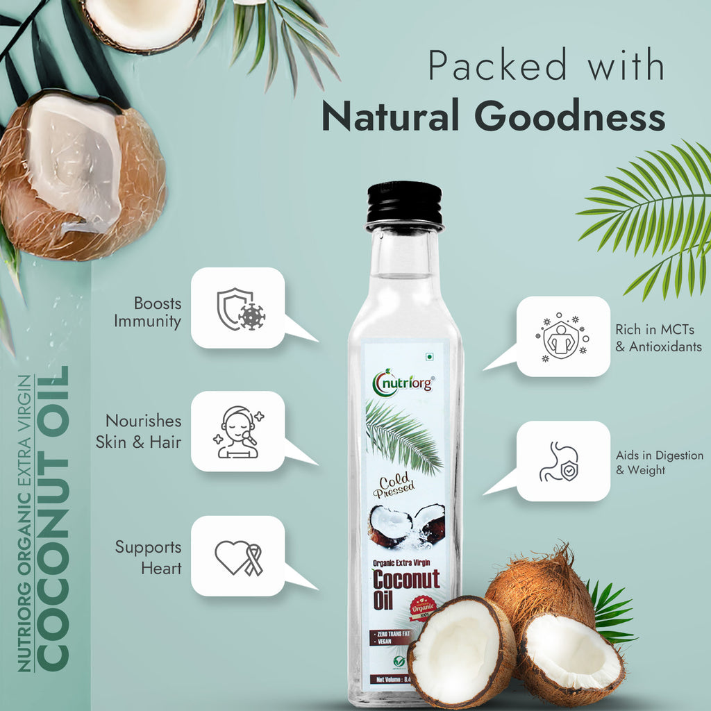 Nutriorg Certified Organic Extra Virgin Coconut oil is one of the most beneficial oils known to mankind and is multi-purpose oil used for cooking, application on skin and hair, aiding weight loss, treating infections, improving digestion and building the body’s immune system. Extra Virgin Coconut oil has earned popularity across the world for its wondrous healing effects. Nutriorg brings to you a premium quality certified organic extra virgin coconut oil which is hygienically extracted from organically grown and cultivated coconuts. It has added advantage for your health since it is multi faceted oil and is organically grown, pure and raw.