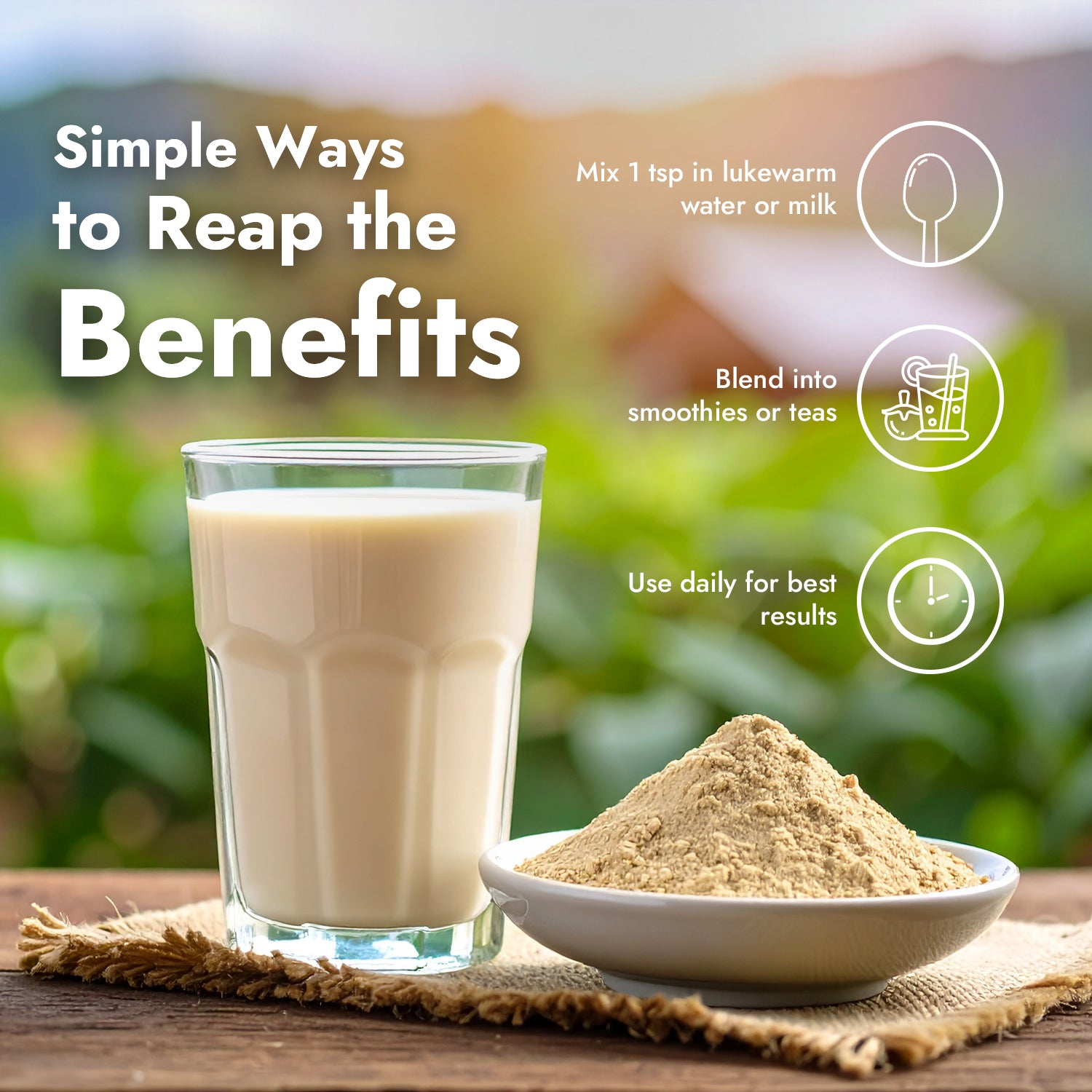 - Roast an ounce of Ashwagandha powder in ghee and mix it with Warm Milk. Drink it at least 20 minutes before breakfast or anytime during the day.