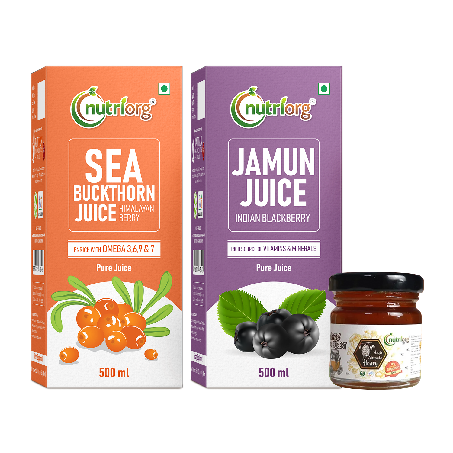 Nutriorg Sea buckthorn Juice and Jamun Juice are made from organic ingredients, which are extracted from the Himalayan Berries and Jamun. It is extremely beneficial for health since it helps to boost immunity & protects skin from harmful effects of sun rays as well. The Vitamin-C content in 1 glass of Sea Buckthorn Juice is equal to 12 glasses of orange juice. This juice can be consumed daily by mixing some amount of water as per personal taste. Nutriorg Jamun Juice is extremely effective for keeping sugar levels in the body in check. It helps to convert starch into energy.