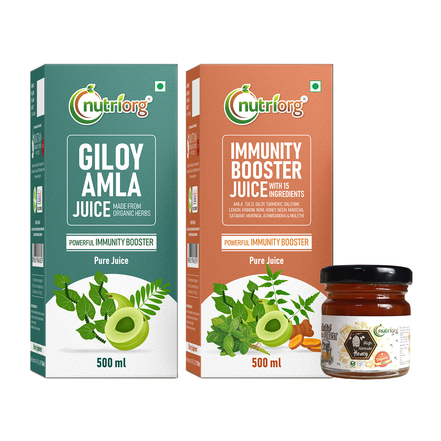 Specifically formulated Immunity Booster Juice & Giloy with Amla Juice Combo to improve your immunity and health overall. The Nutriorg Immunity Booster Juice is a healthy combination of Giloy, Tulsi, Neem, Haldi, Dalchini and Lemon with honey, amla and noni. This juice is known to have anti-microbial properties and helps in improving overall health. The Giloy with Amla Juice is 100% natural and has been extracted from organic Giloy and Amla. Amla is the richest source of vitamin C.