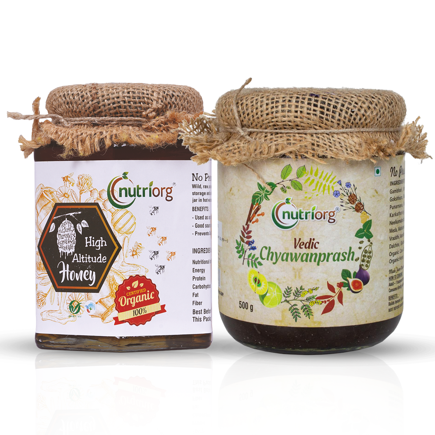Nutriorg Organic High Altitude Honey is naturally complete with healthful minerals and nutrients & perfect for adding sweetness to your life by the spoonful, as well as your favorite Tea toast & Desserts. Nutriorg Vedic Chyawanprash is made from organic herbs and fruits. It comprises of : Amla, Patala, Agnimantha, Gambhari, Bilva, Shyonaka, Gokshura, Shalaparni, Brihat, Kantakari, Pippali, Karkatshringi, Draksha, Guduchi, Haritaki, Bala, Tamalaki, Vasa, Jiwanti, Shati Musta, Pushkara, Kakanasika, Mudgaparni, Mashaparni, Vidari, Bulbifera, Meda, Mahameda, Jivaka, Rishabhak, Kshir Kakoli, Ghrita, Vamsha, Tvak, Sukshamaila, Tvakpatra, Nagkesara, Bhrak Bhasma, Mukta Pishti, Akarkarabha, Lavanga, Kumkum, Sesame Oil and Honey. The Nutriorg Vedic Chyawanprash is a combination of 48 herbs and 6 other ingredients. It is less sweet than other such products to increase its nutritional value and be less on calories.