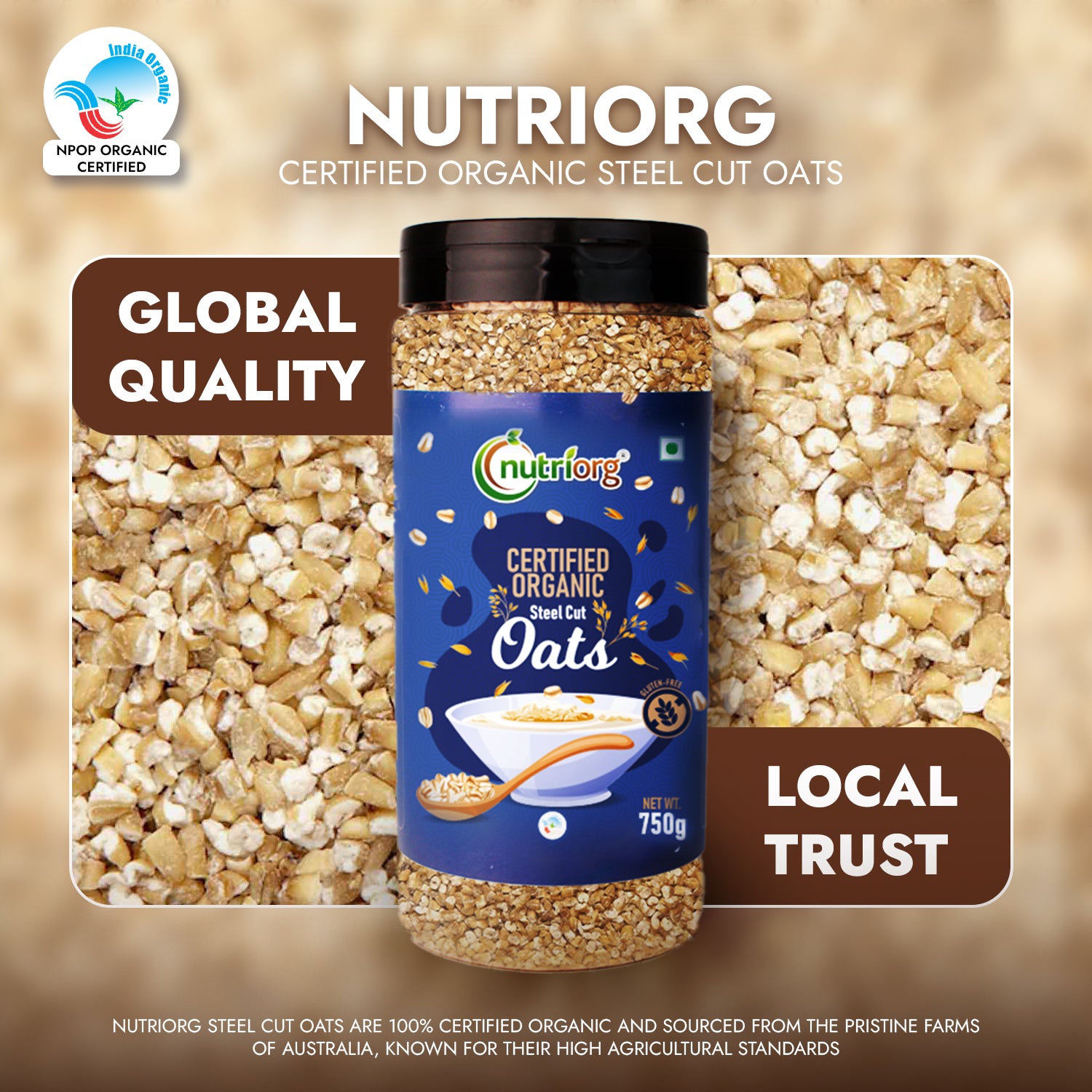 Organic Steelcut Oats (750g): Savor the hearty goodness of Nutriorg Organic Steelcut Oats. Made from whole oat groats that are chopped into pieces, these oats retain their natural chewy texture and robust flavor. Bursting with dietary fiber, they support digestion, help stabilize blood sugar levels, and provide sustained energy. With their unique texture, they're perfect for those who enjoy a more textured oatmeal experience.