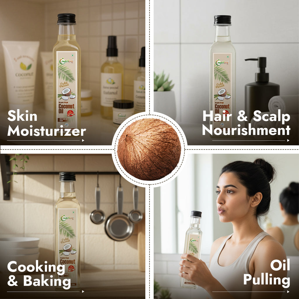 Nutriorg Certified Organic Cold Pressed Virgin Coconut Oil is unrefined oil which is extracted from coconut which is organically grown. Coconut is shredded & cold pressed to generate coconut oil and separated to extract pure and high-quality oil. It has added advantages for your health since it is multi-faceted oil and is organically grown, pure, and raw. Coconut Oil has properties that modestly hike good cholesterol levels in the body. Coconut oil is known to slowdown the aging process.