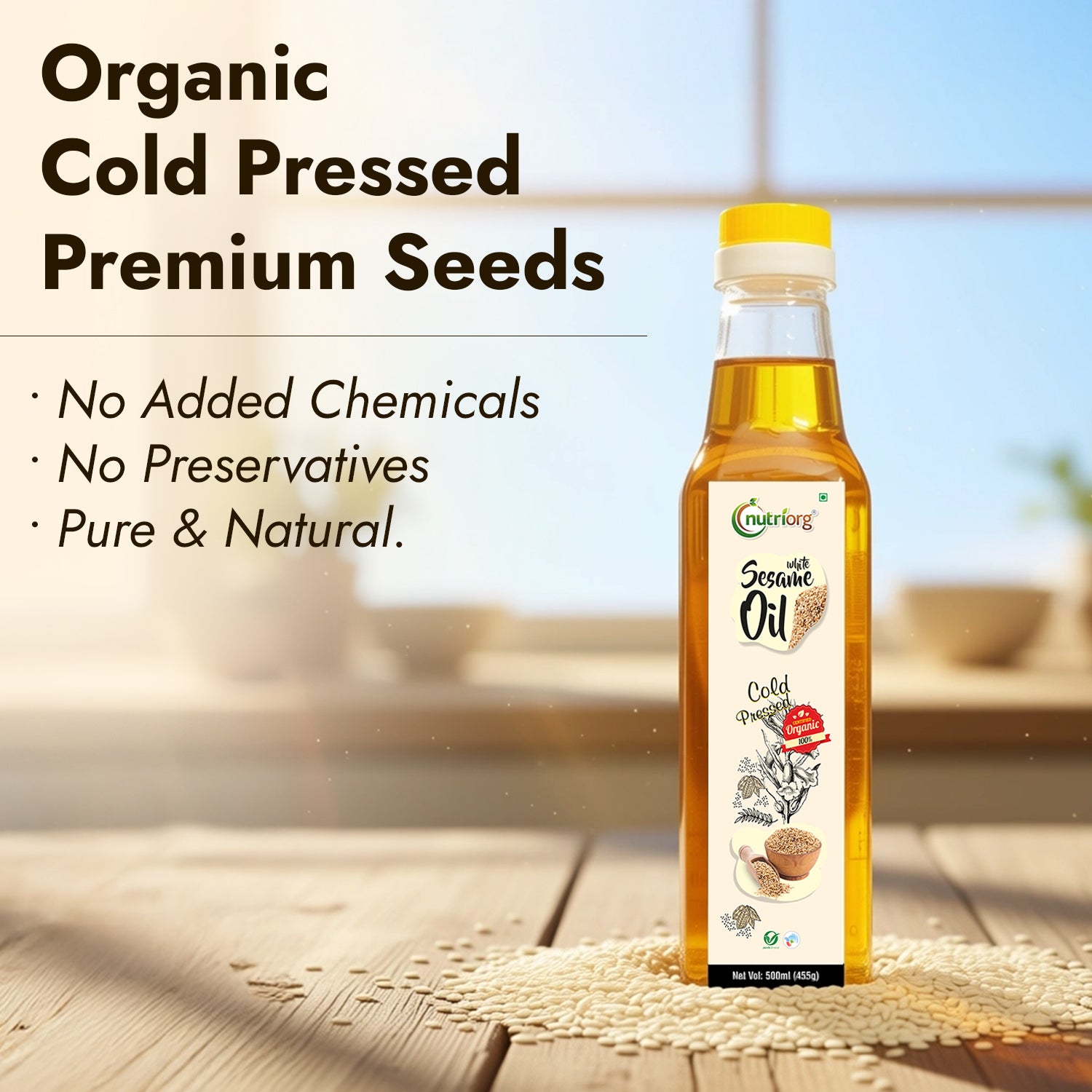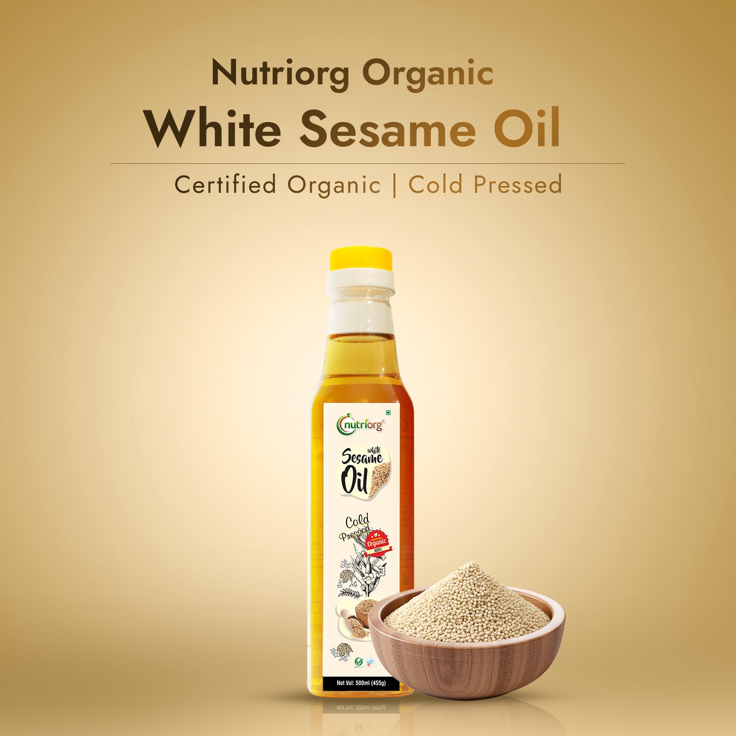 White Sesame oil is known as the 'Queen of oils' for its healing properties as mentioned in the Vedas. Nutriorg manufactures certified sesame oil which is extracted from organically produced sesame seeds. It is one of the healthier options compared to normal vegetable oil. The sesame seeds are primarily grown in African and Indian subcontinent. It is relatively popular as it is cheaper to extract the oil. It is also used in Asian, Japanese, Chinese and Middle Eastern cuisines due to its multiple benefits. Sesame oil contains sesamol and sesaminol, two antioxidants that may have powerful effects on your health. Antioxidants are substances that help reduce cell damage caused by free radicals. Sesame oil is well known for its anti-inflammatory properties. It is great for taking care of joint inflammation, toothaches, and scrapes. Sesame oil comprises 82% unsaturated fatty acids. The sesame oil has a good amount of Vitamins, minerals, compounds and other crucial ingredients which make it a healthier choice.