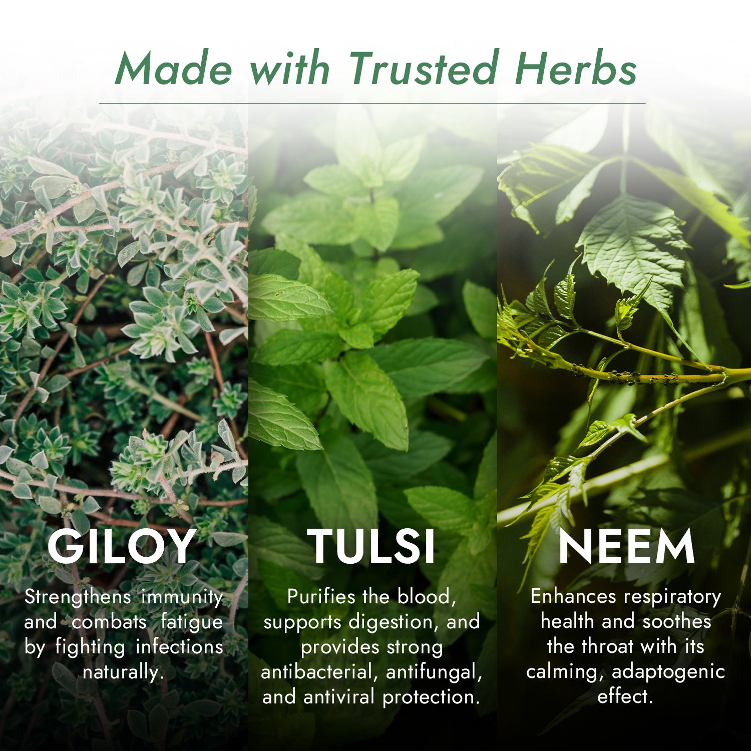 ● Boosts Immunity: Giloy, Neem, and Tulsi are renowned for their immune-stimulating properties, helping to fortify your body's defenses.