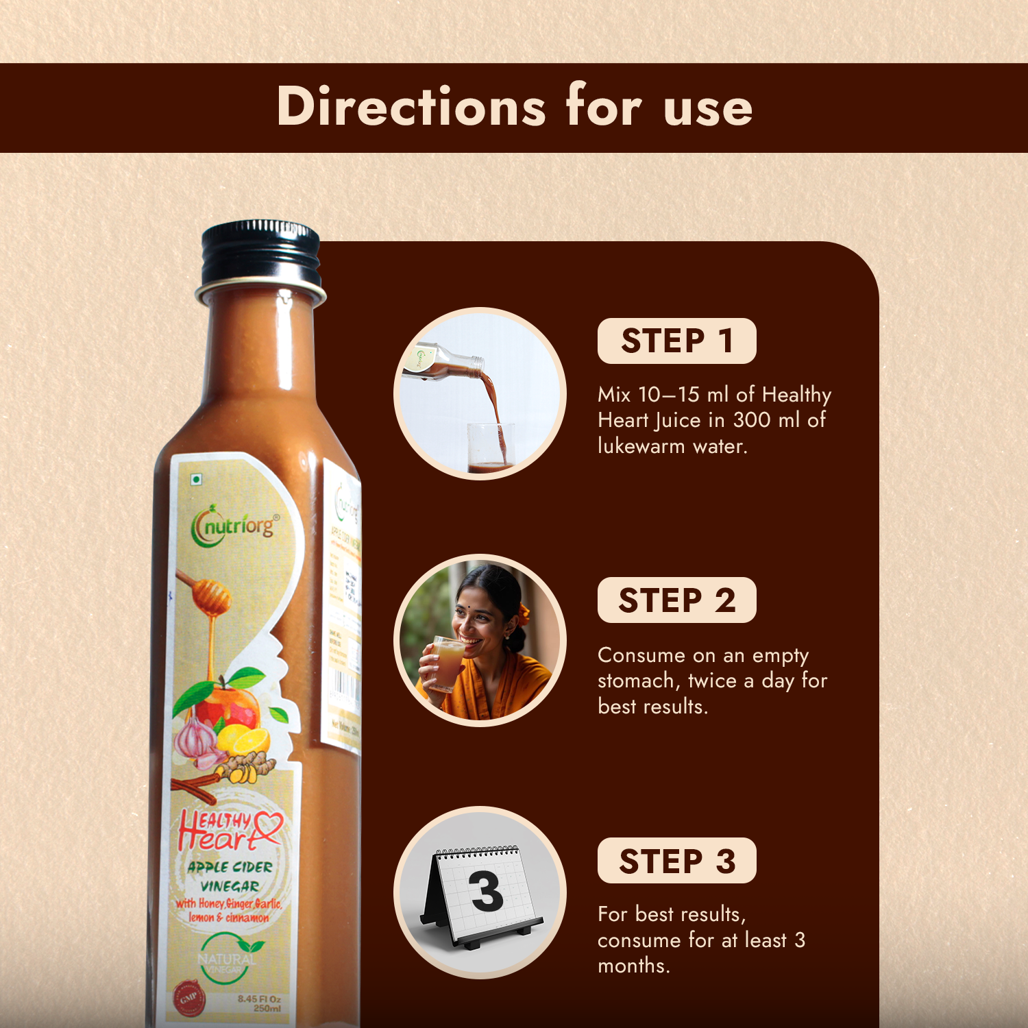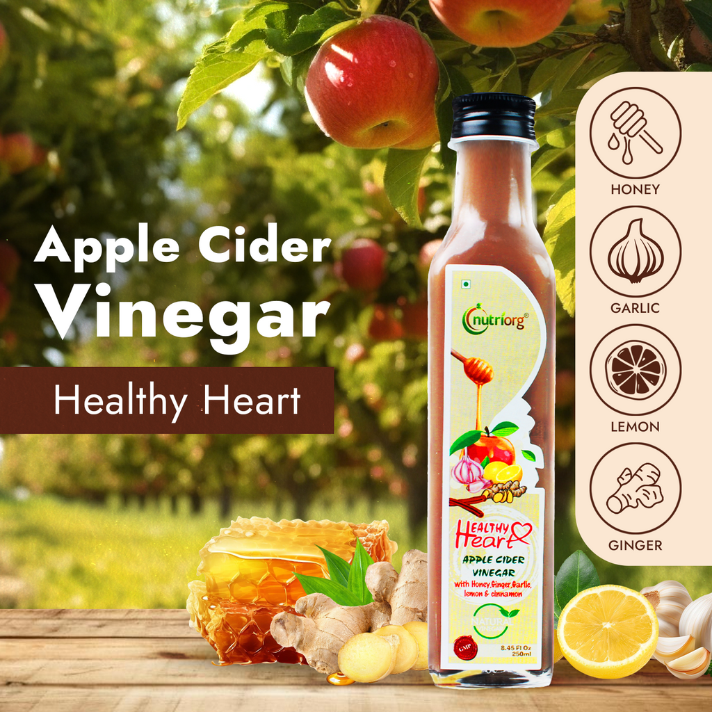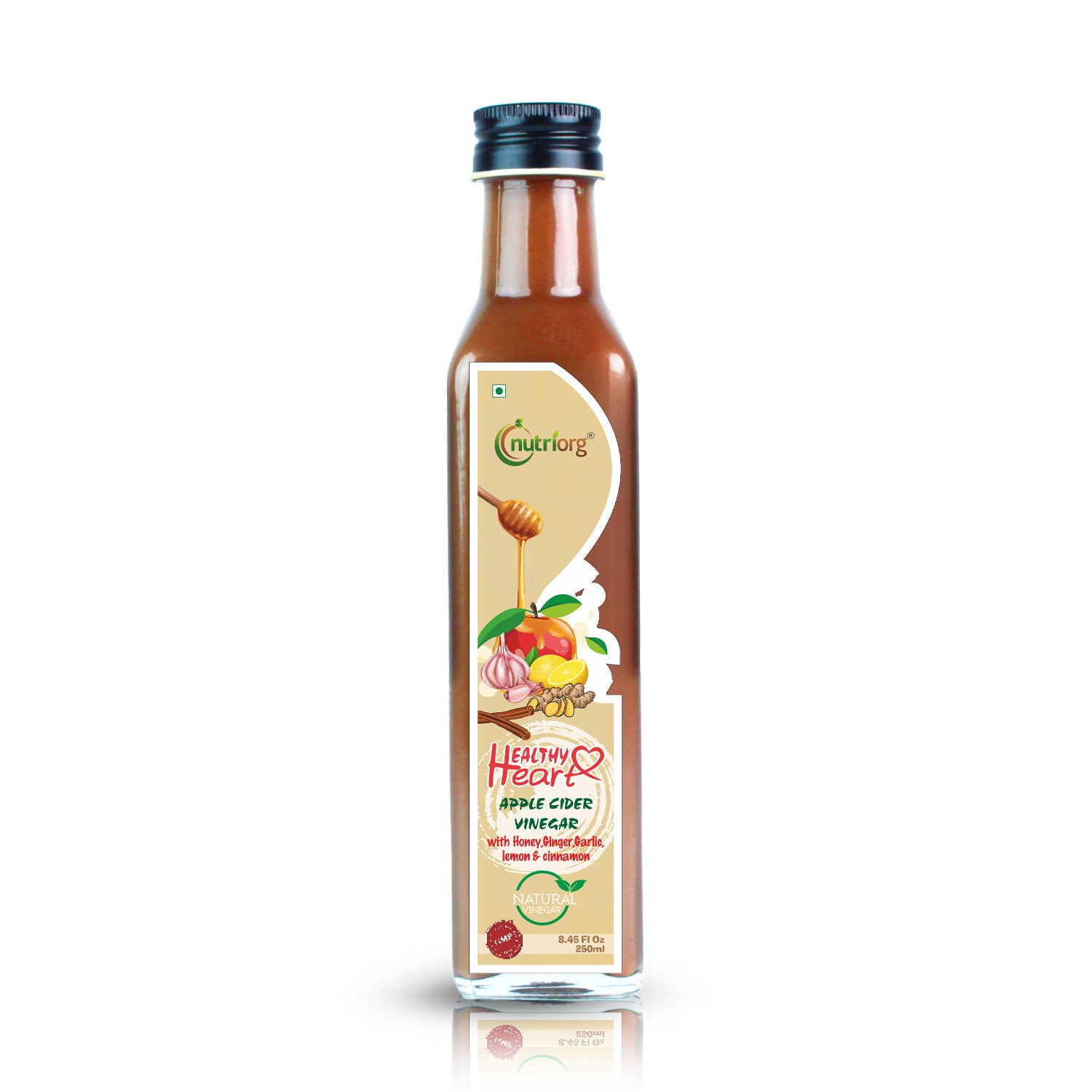 Nutriorg Healthy Heart Apple Cider Vinegar is a unique formulation of Apple Cider Vinegar with honey, ginger, garlic, lemon, and cinnamon. This concoction of ingredients is a very strategic mix as the ingredients were all used since time immemorial for improving cholesterol levels in the body. They were used to cut the stubborn cholesterol that would later lead to various bodily problems. This formula contains 5 traditional organic herbs which work in synergy with Heart Health. Nutriorg’s Healthy Heart Apple Cider Vinegar improves heart and overall health.