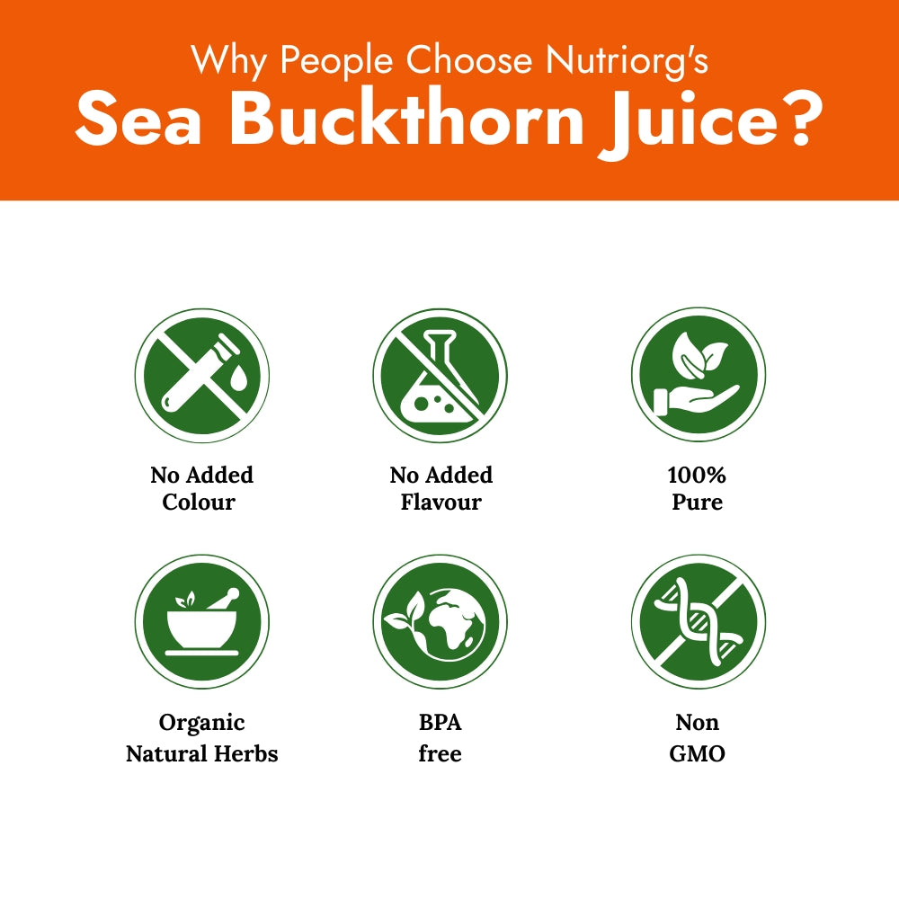 Nutriorg Sea Buckthorn juice is a 99.98% pure pulp concentrate, rich in Vitamin C, Omegas 3, 6, 9, and rare Omega 7, along with 190+ bioactive nutrients. It supports gut health, liver function, immunity, and overall energy.