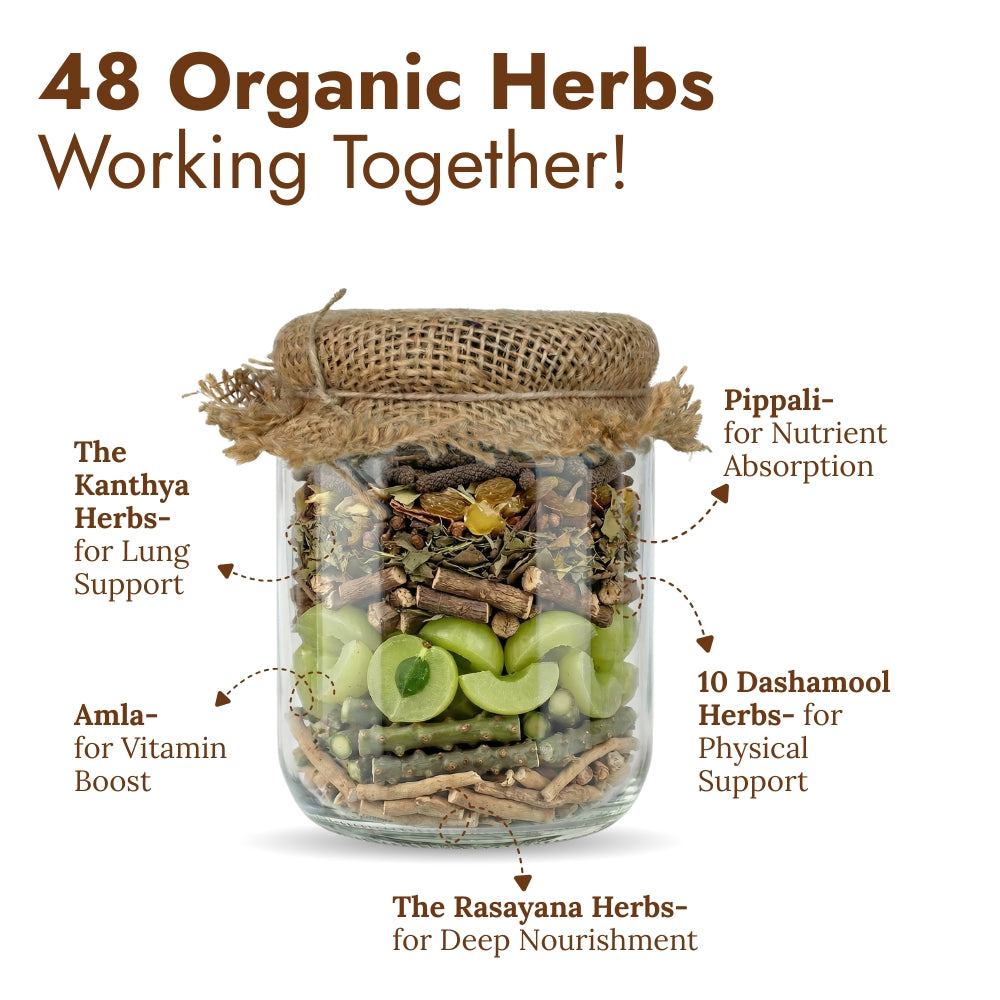 Nutriorg Vedic Chyawanprash is made from organic herbs and fruits. It comprises of : Amla, Patala, Agnimantha, Gambhari, Bilva, Shyonaka, Gokshura, Shalaparni, Brihat, Kantakari, Pippali, Karkatshringi, Draksha, Guduchi, Haritaki, Bala, Tamalaki, Vasa, Jiwanti, Shati Musta, Pushkara, Kakanasika, Mudgaparni, Mashaparni, Vidari, Bulbifera, Meda, Mahameda, Jivaka, Rishabhak, Kshir Kakoli, Ghrita, Vamsha, Tvak, Sukshamaila, Tvakpatra, Nagkesara, Bhrak Bhasma, Mukta Pishti, Akarkarabha, Lavanga, Kumkum, Sesame Oil and Honey. The Nutriorg Vedic Chyawanprash is a combination of 49 herbs and 5 other ingredients. It is less sweet than other such products to increase its nutritional value and be less on calories. It is a 5000 year old Ayurvedic formula in the form of a multi-herbal jam. It is believed to be a “Rasayana” for all the tissues of the Human body. “Rasayana” promotes systemic rejuvenation of the mind and body. Antioxidant-rich spices, botanicals and herbs are combined in a specific amount with ghee, black sesame oil and honey to make a delicious jam that can regularly be consumed to support overall health and vitality."