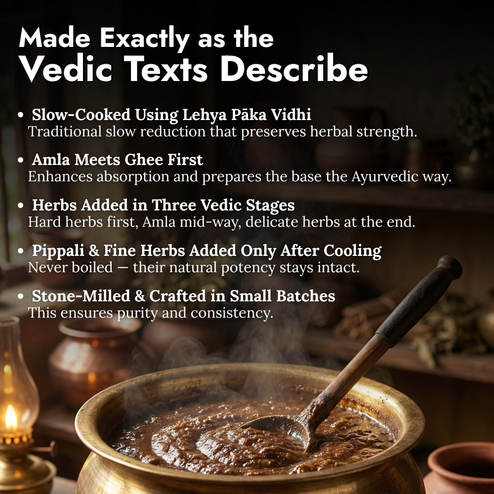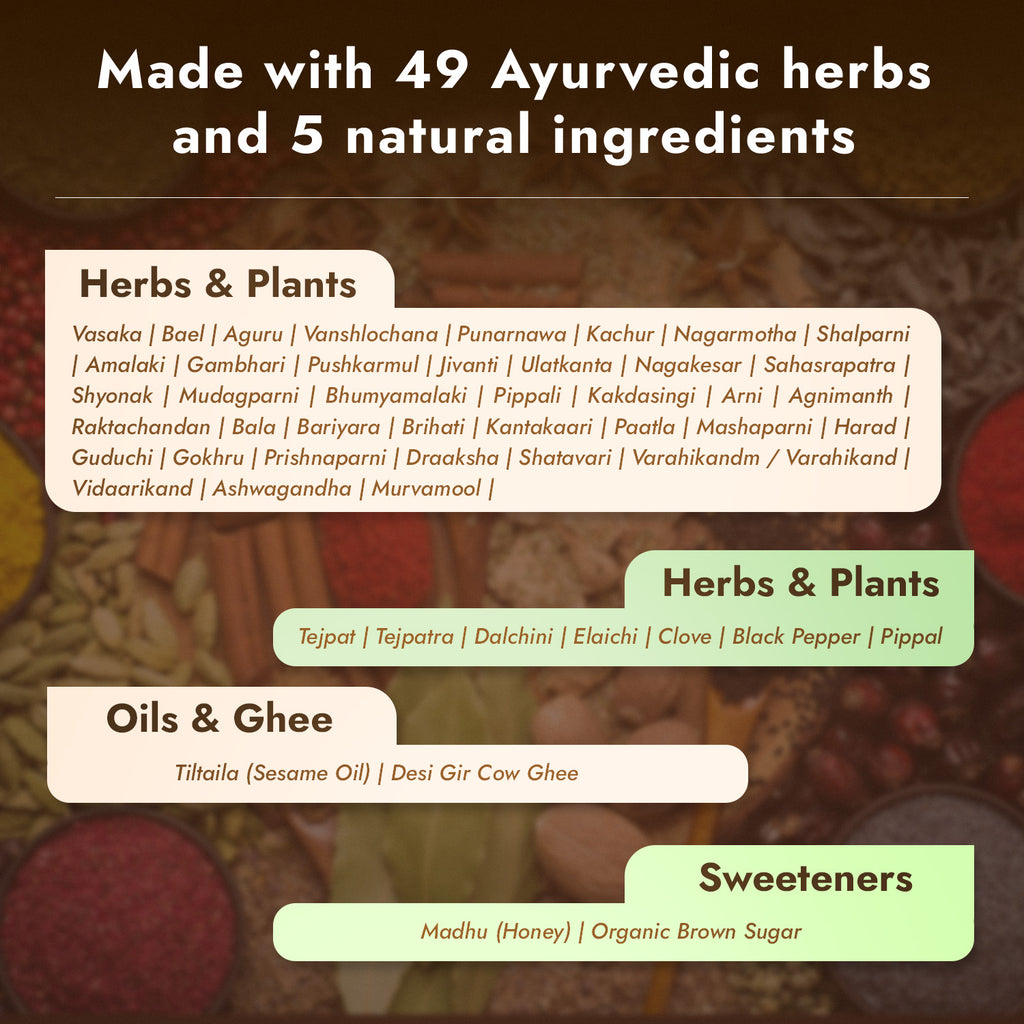 Nutriorg Vedic Chyawanprash is made from organic herbs and fruits. It comprises of : Amla, Patala, Agnimantha, Gambhari, Bilva, Shyonaka, Gokshura, Shalaparni, Brihat, Kantakari, Pippali, Karkatshringi, Draksha, Guduchi, Haritaki, Bala, Tamalaki, Vasa, Jiwanti, Shati Musta, Pushkara, Kakanasika, Mudgaparni, Mashaparni, Vidari, Bulbifera, Meda, Mahameda, Jivaka, Rishabhak, Kshir Kakoli, Ghrita, Vamsha, Tvak, Sukshamaila, Tvakpatra, Nagkesara, Bhrak Bhasma, Mukta Pishti, Akarkarabha, Lavanga, Kumkum, Sesame Oil and Honey. The Nutriorg Vedic Chyawanprash is a combination of 49 herbs and 5 other ingredients. It is less sweet than other such products to increase its nutritional value and be less on calories. It is a 5000 year old Ayurvedic formula in the form of a multi-herbal jam. It is believed to be a “Rasayana” for all the tissues of the Human body. “Rasayana” promotes systemic rejuvenation of the mind and body. Antioxidant-rich spices, botanicals and herbs are combined in a specific amount with ghee, black sesame oil and honey to make a delicious jam that can regularly be consumed to support overall health and vitality."