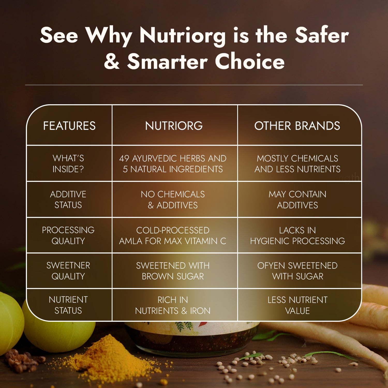 - Nutriorg Vedic Chyawanprash is rich in antioxidants, immunity-boosting and healing herbs.